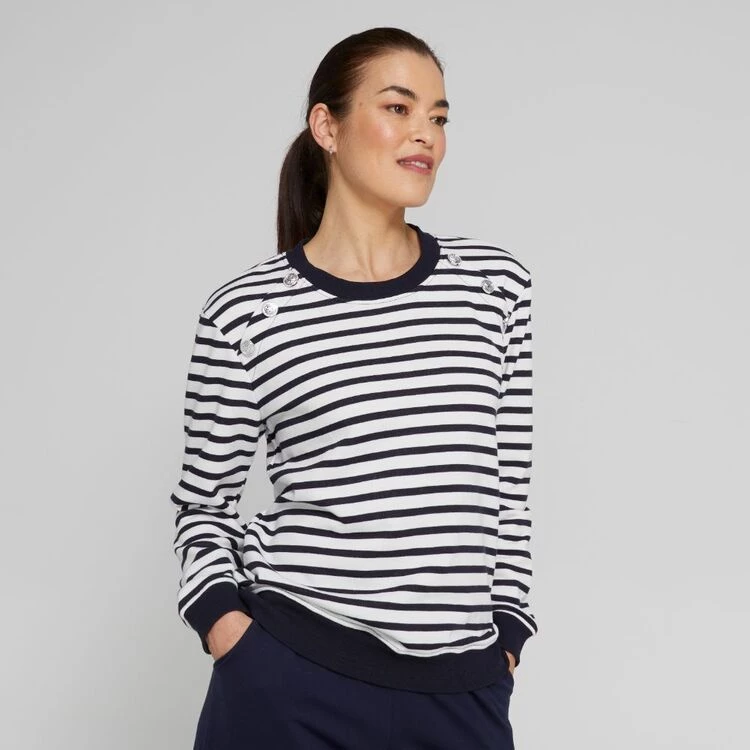 A lovely navy & white stripe detailed piece, the Anthology Button Crew Neck Jumper is designed with a crew neckline and full length sleeves. The front shoulder features a row of silver buttons leading to the sleeve, while the neckline, sleeves and hem are finished with a nice rib detail. Wear back with dark pants and white sneakers for a chic and casual look!