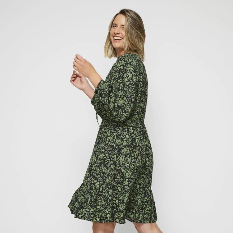 The Estelle Jubilee Dress in a sophisticated black and green femme floral print, features an elasticated waist, long blouson sleeves and a flirty hem ruffle. Stylish and versatile, this wardrobe essential will seamlessly take you from desk to dinner, outfitted with your favourite black boots and winter coat.