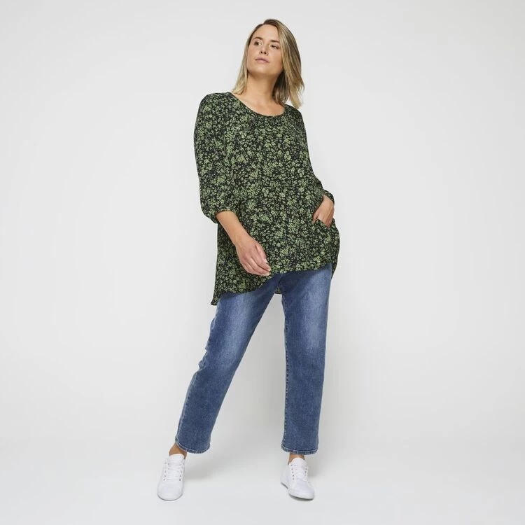 The Estelle Jubilee Top is a floaty femme style for everyday wear, featuring a flattering round neck, 3/4 length sleeves, waist seam and deep fluted hi low hem. This versatile piece has a sophisticated black and green floral print that pairs back beautifully with the Estelle Night Sky Black Pant for an elevated look.