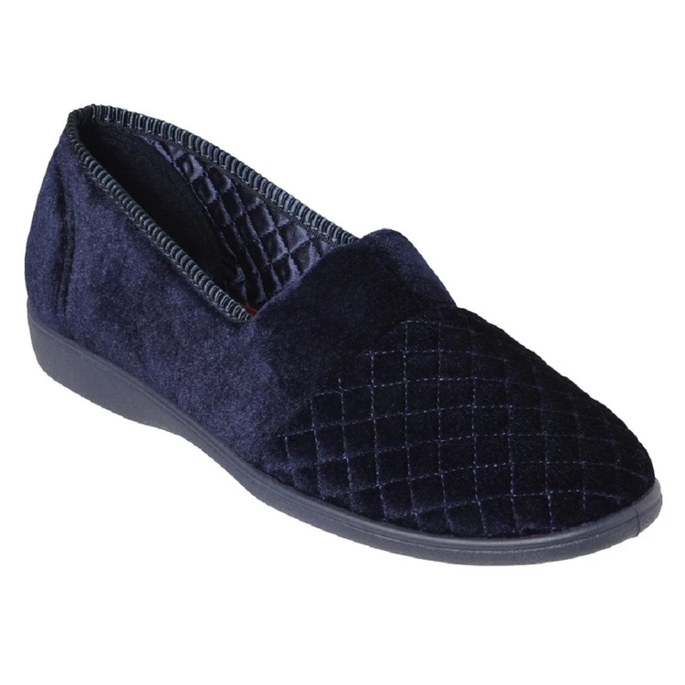 With a classic slip on shape and warm, cushioned interior, these Grosby Marcy Quilted Velour Slippers are perfect for wearing around the house. Keep your feet comfy, snug and warm on those cold winter mornings, or after a long day out and about. Featuring a timeless quilted design and a deep, stylish blue colour, these slippers will leave your feet feeling and looking their best.