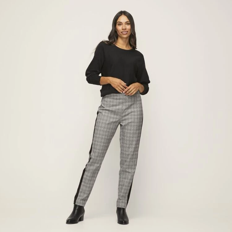 Designed exclusively for Harris Scarfe, the Jane Lamerton Contrast Houndstooth Pant is the perfect tailored pant to take you from desk to dinner. Made with a classic houndstooth stretch fabric, combined with contrast black panels, make these bottoms perfect to pair back with Jane’s tops and jackets and heels for a chic, effortless look.