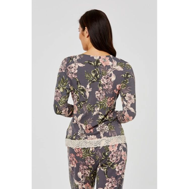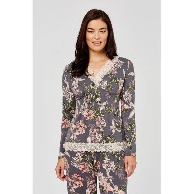 Designed exclusively for Harris Scarfe, this Jane Lamerton Winter Floral Lace Jersey Top is a classic sleepwear top that works perfectly paired back with the matching Winter Floral Lace Jersey Pant. This cosy top has long sleeves and soft lace detail on the neckline and hem, making it the perfect wardrobe essential during those cooler winter nights.