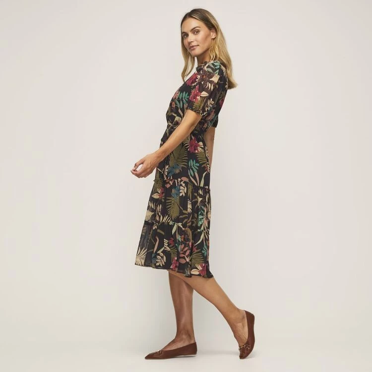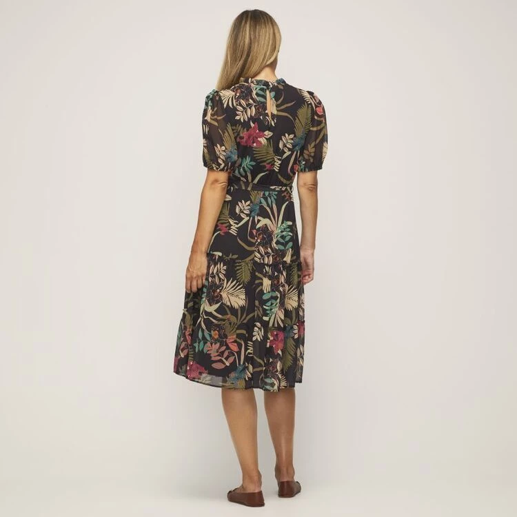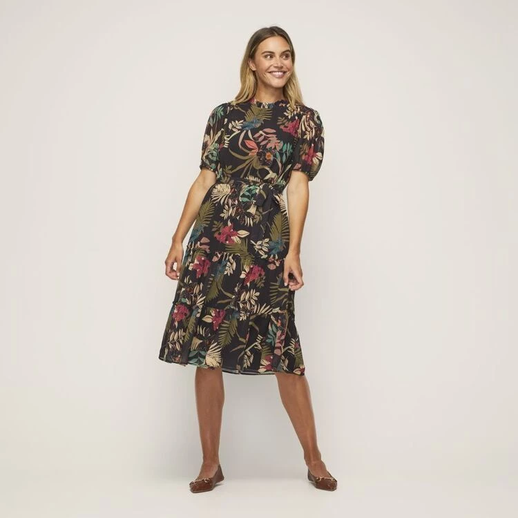 The JB Jayson Brunsdon Tiered Puff Sleeve Midi Dress is intricately designed with an elegant winter floral print, gathered bodice with a tie neck accent and short puff sleeve with an elasticated finish. Made in a breezy woven chiffon with a rounded neckline, this dress continues to a tiered midi skirt with ruffle detail, perfect for a dinner date!