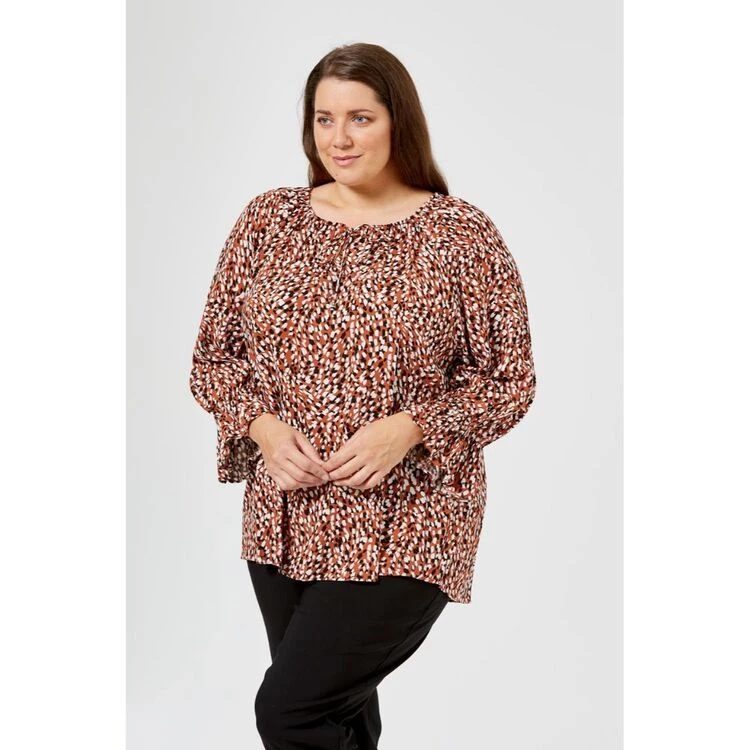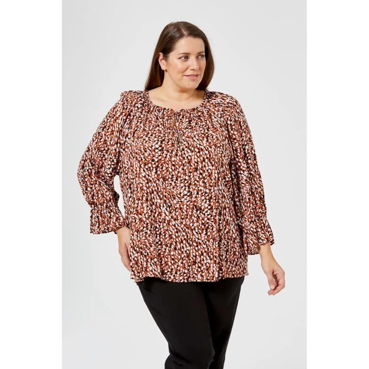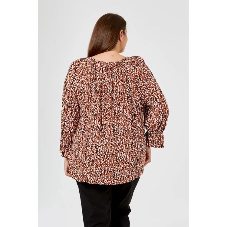 Designed exclusively for Harris Scarfe, this Khoko Plus Flowing Smock Top is a flattering tunic style top with a neckline tie, flowy sleeves and finished with an elastic detail to ruffle the sleeve. Its fun and fabulous print makes it a colourful addition to your wardrobe, and can be easily paired with black pants and strappy sandals for a stylish look.