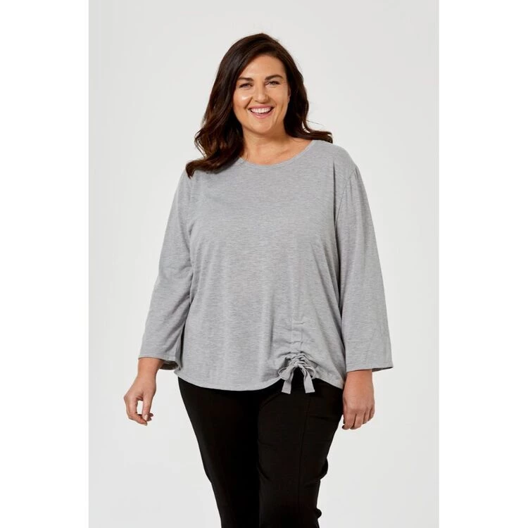 Designed exclusively for Harris Scarfe, the Khoko Plus Ruched Detail 3/4 Sleeve Tee has a round neck and tee shape with 3/4 sleeves, featuring a herringbone fabric tape to rouch up the hem to style your own way. Made from soft jersey slub fabric, this top is perfect for everyday wear, whether it be going for a quick grocery run or simply just lounging at home. Match it back with one of our many comfortable bottoms for a casual, laidback look.