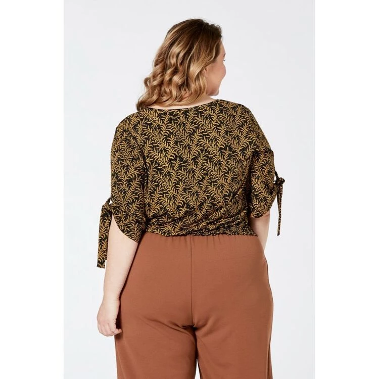 Featuring shirred waist detail, gold eyelet trim and tie detail sleeves