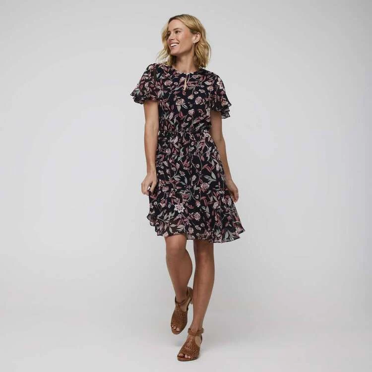 Khoko Smart Flutter Sleeve Ruffle Dress Navy & Floral