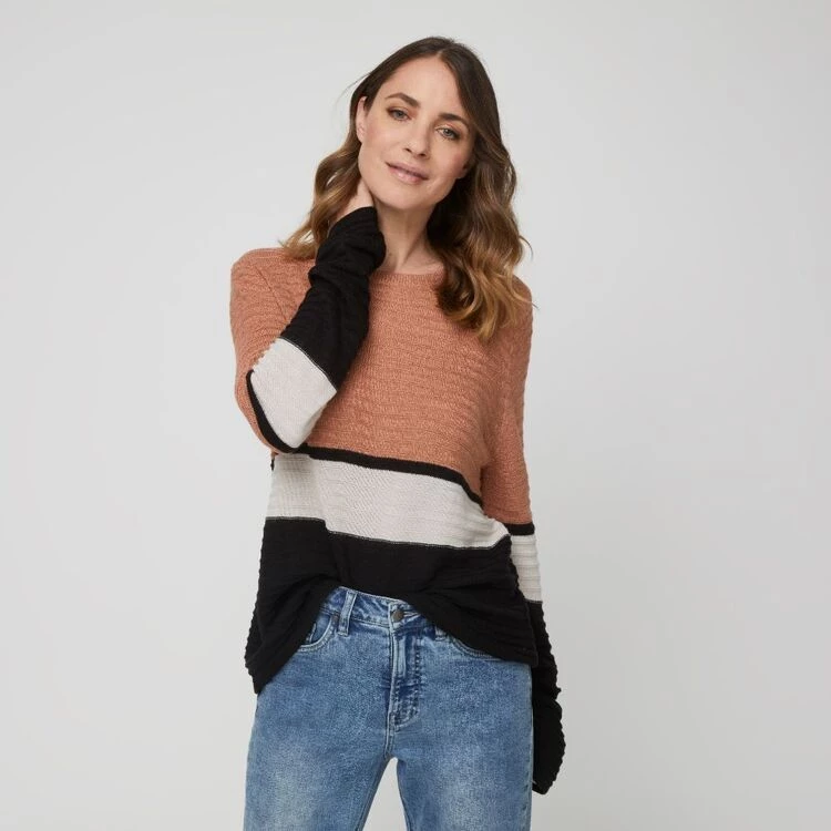 The Khoko Smart Spliced Jumper is a lovely stripe detail jumper that combines texture with splices of classic and seasonal colours. With a comfortable relaxed fit in soft knit for elevated and every day dressing, this wardrobe essential can be paired with denim jeans and white sneakers for an easy winter look.