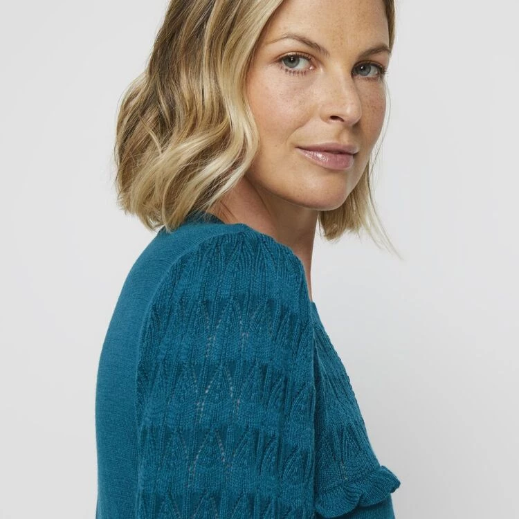 Gorgeous and perfect for winter, the Leona Edmiston Lace Pointelle Knit Jumper is designed exclusively for Harris Scarfe by Leona Edmiston. This pretty pull over feminine jumper is designed using lace pointelle technique, knitted from soft-wool blend yarn for an extra cosy feel. The ruffle detailing along the front and sleeve cuff add extra sophisticated flair. The wool-blend quality feels beautifully lightweight against your skin, pairing well with a pant or skirt for an effortless cold weather look. This jumper comes in a bold magenta or elegant hunter green colourway.