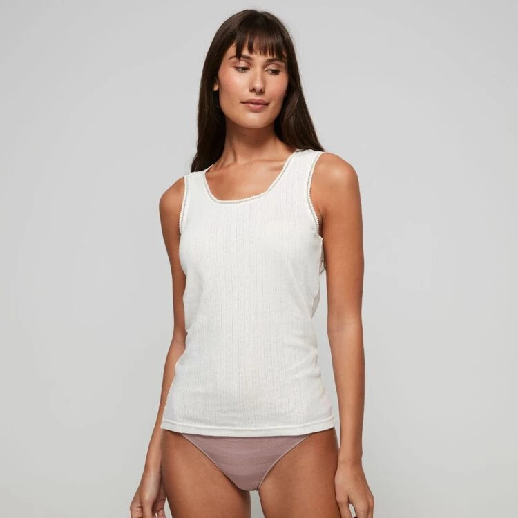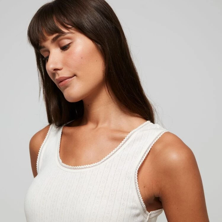 The Sash & Rose Pointelle Thermal Vest is a great piece for layering during the cooler days with its soft cotton viscose fabrication and sleeveless design that could be easily worn over a long sleeved tee. Brushed for warmth, this vest is also blended with natural fibres for added comfort and breathability. Its scoop neck pointelle design and delicate lace detailing make it a fashionable choice for the winter!