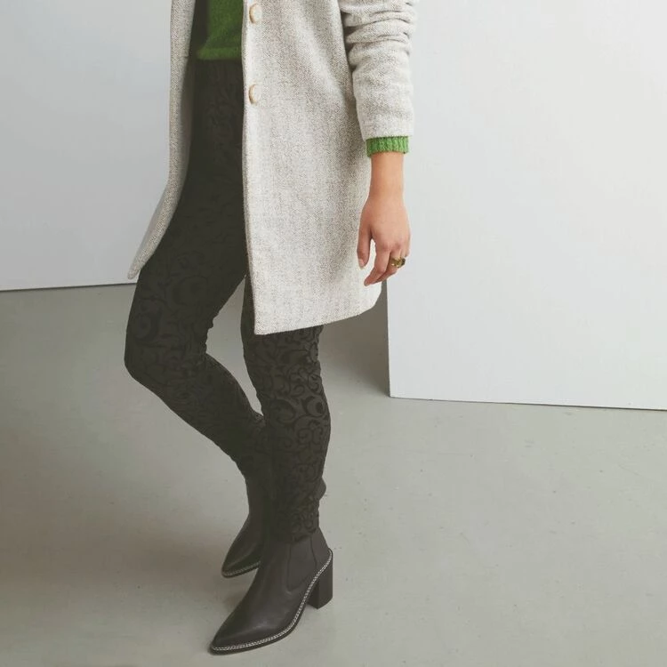 The Stella Embossed Legging is a luxe elevated take on a classic style, featuring a standout romantic vine flocked velvet pattern, high rise fit and a stretch fabrication with elastic at the waist. This legging is a great piece for your winter wardrobe and can be easily paired with the Stella Roll Neck Knit to complete the look.
